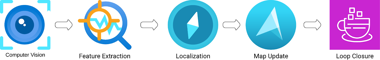 📌 그림 1-2: SLAM의 구성도 - 센서 입력 → 특징 추출 → 위치 추정 → 지도 업데이트 → Loop Closure