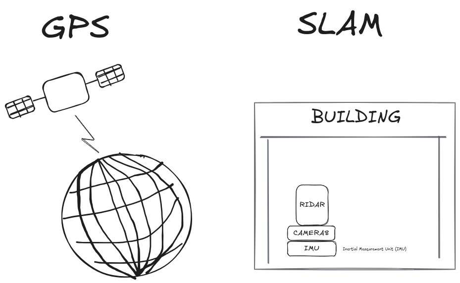 📌 그림 1-1: GPS와 SLAM 비교 도식 – GPS는 위성 신호에 의존, SLAM은 센서를 활용해 내부 지도를 만듦