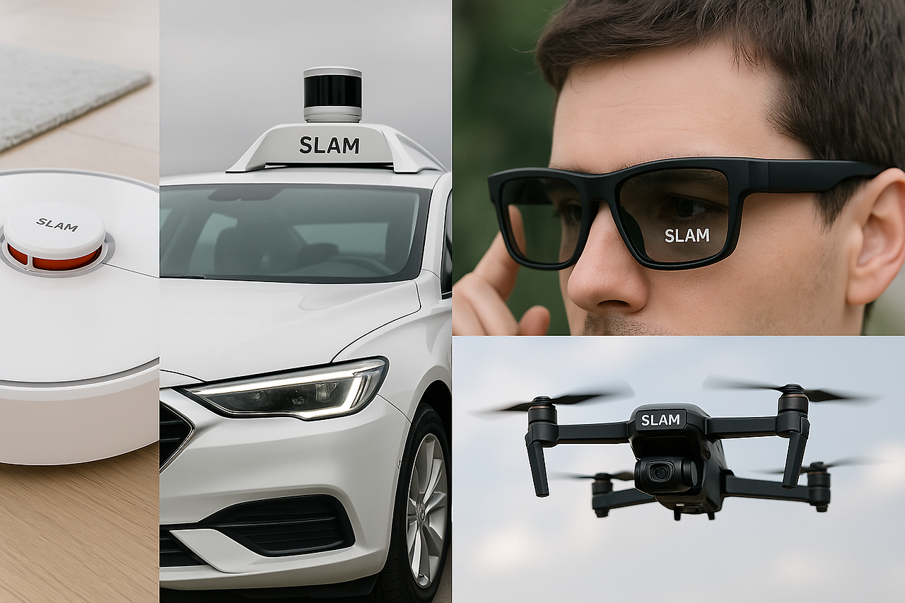 📌 그림 1-3: SLAM 기술이 적용된 실제 제품 사진 (로봇청소기, 자율주행차, AR 글래스, 드론)